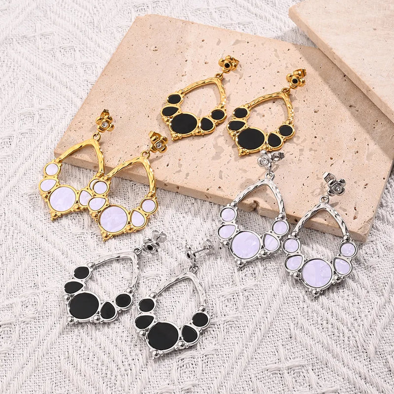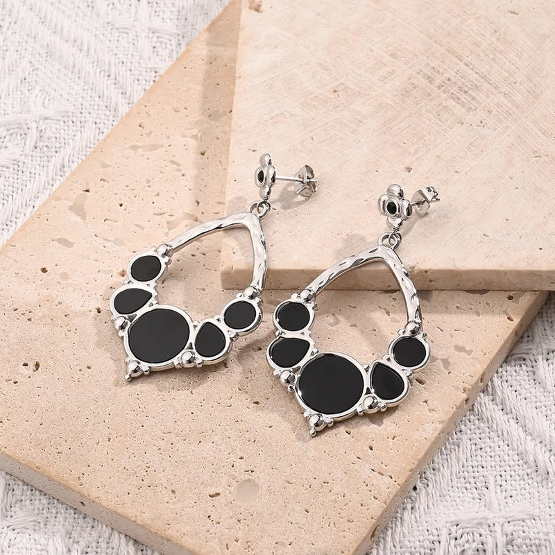 Rhinestone Flower & Pierced Black Shell Water Drop Ear Studs (Steel Color)