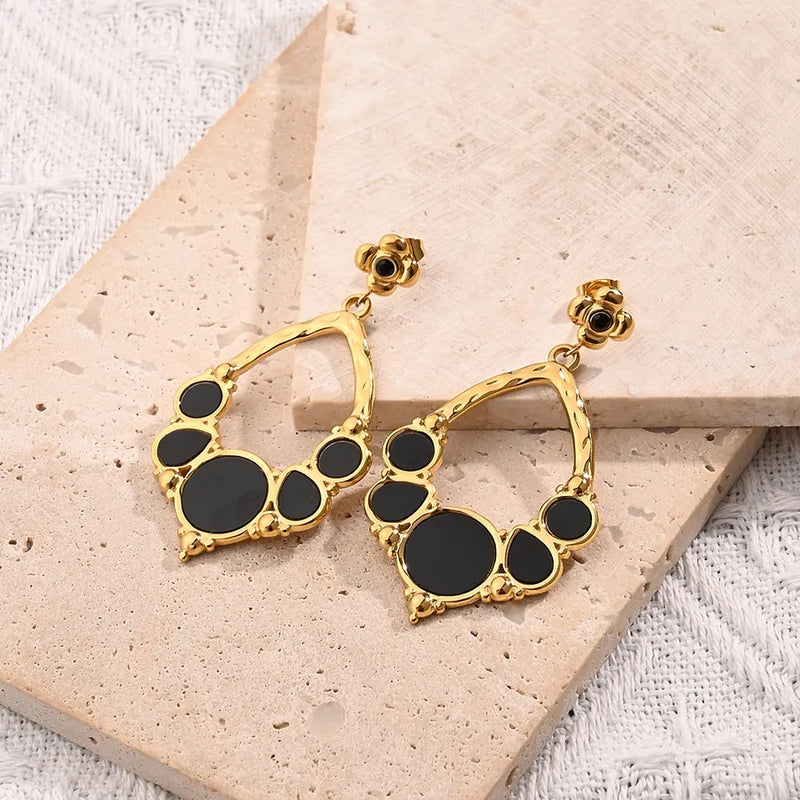 Rhinestone Flower & Pierced Black Shell Water Drop Ear Studs (Gold)