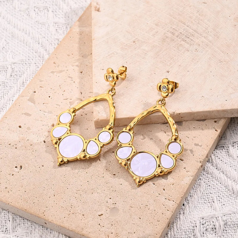 Rhinestone Flower & Hollow White Shell Water Drop Ear Studs (Gold)