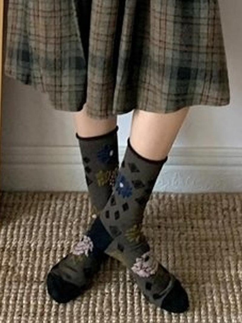 3 Pairs Women Artsy Flower Embossing Colorblock Socks
