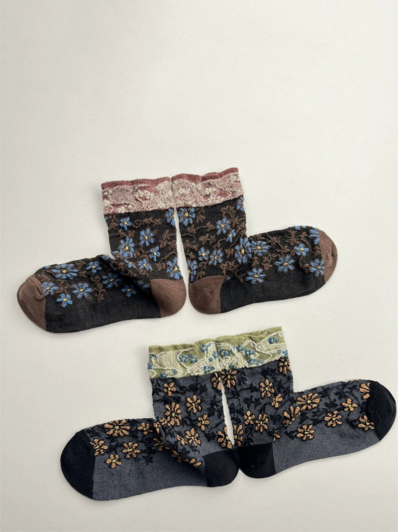 5 Pairs Women Ethnic Flower Embossing Cotton Socks