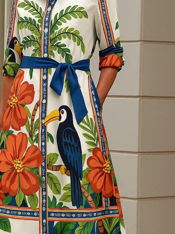 | Feature | Pockets . Tied Waist . Flower Print . Buttoned . Contrast Color |