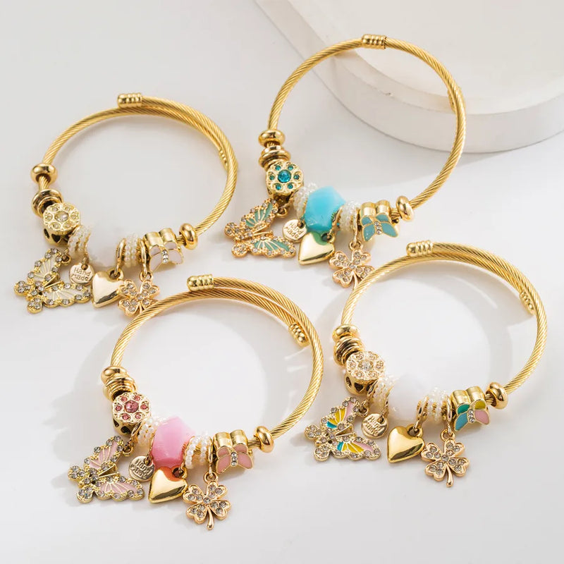 Elegant Four Leaf Clover Heart Shape Butterfly Alloy Titanium Steel Tube Stretch Adjustable Bangles Wholesale