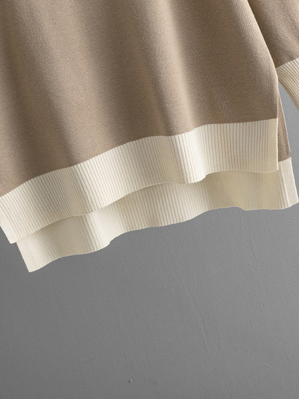 High-Low Contrast Color Split-Side V-Neck Sweater Tops + Elasticity Pants Trousers Two Pieces Set