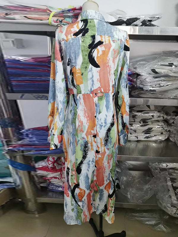 High Waisted Long Sleeves Asymmetric Pleated Printed Split-Joint Deep V-Neck Midi Dresses
