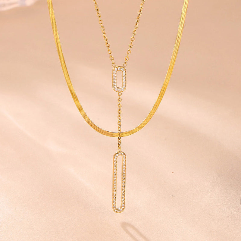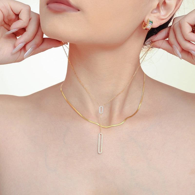 Jewelry Elegant Luxurious Vacation Rectangle Titanium Steel 18K Gold Plated Rhinestone Necklace