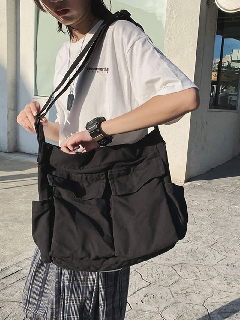 This large capacity casual canvas shoulder bag is perfect for your daily essentials. The main compartment has an adjustable strap and two side pockets. There are two interior slip pockets and a zippered pocket inside. This bag can be used as a backpack or crossbody bag.