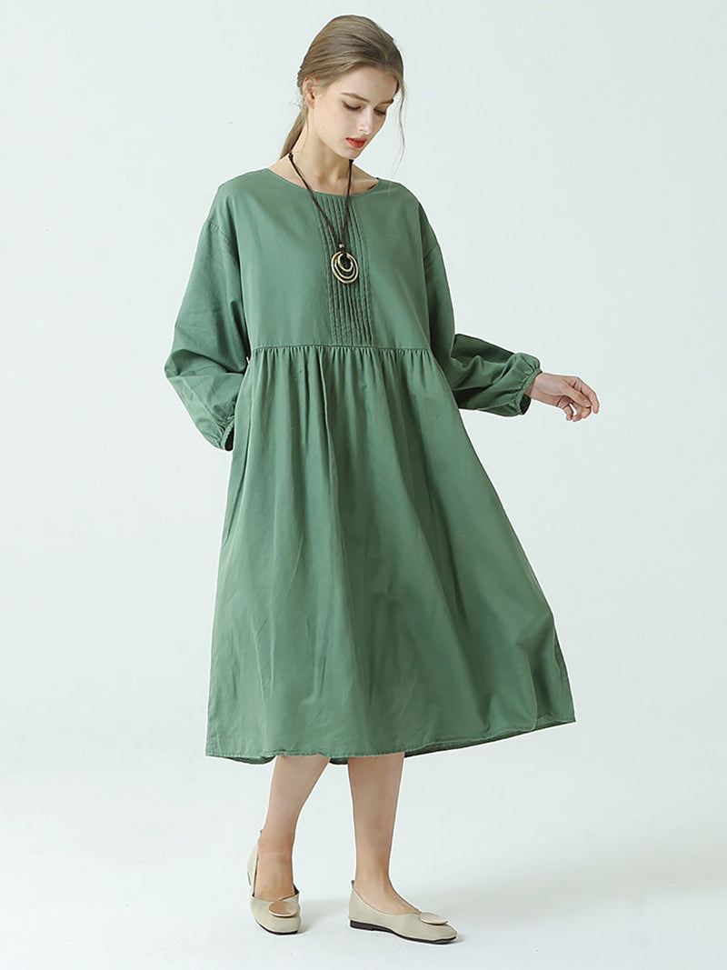 Plus Size Linen Cotton Pleated Spring Long Sleeve Dress