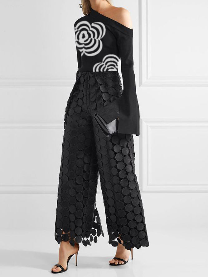 Long Sleeves Loose Flower Print One-Shoulder T-Shirts Tops