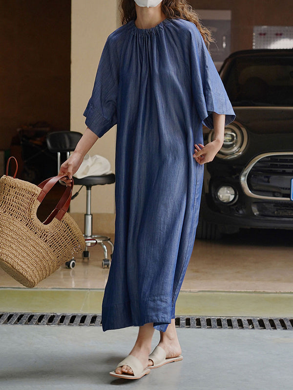 Loose Raglan Sleeve Drawstring Lace-Up Pleated Solid Color Round-Neck Midi Dresses