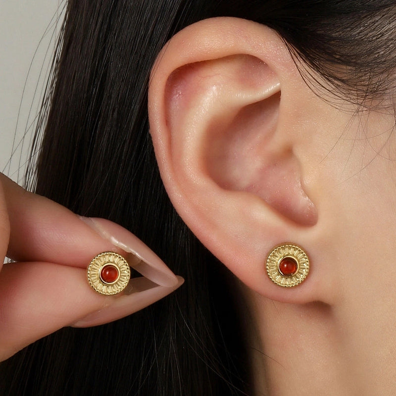 One Pack and Two Pairs Retro French Style Geometric Plating Titanium Steel Natural Stone 14K Gold Plated Ear Studs