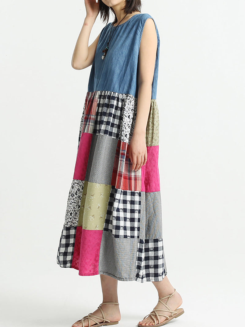 Crafted from 100% cotton. this ankle-length summer dress features a spliced patchwork design and an O-neck collar. Its sleeveless cut ensures breathability and comfort. while the loose fit provides ease of movement. making it an ideal choice for warm-weather wear.
