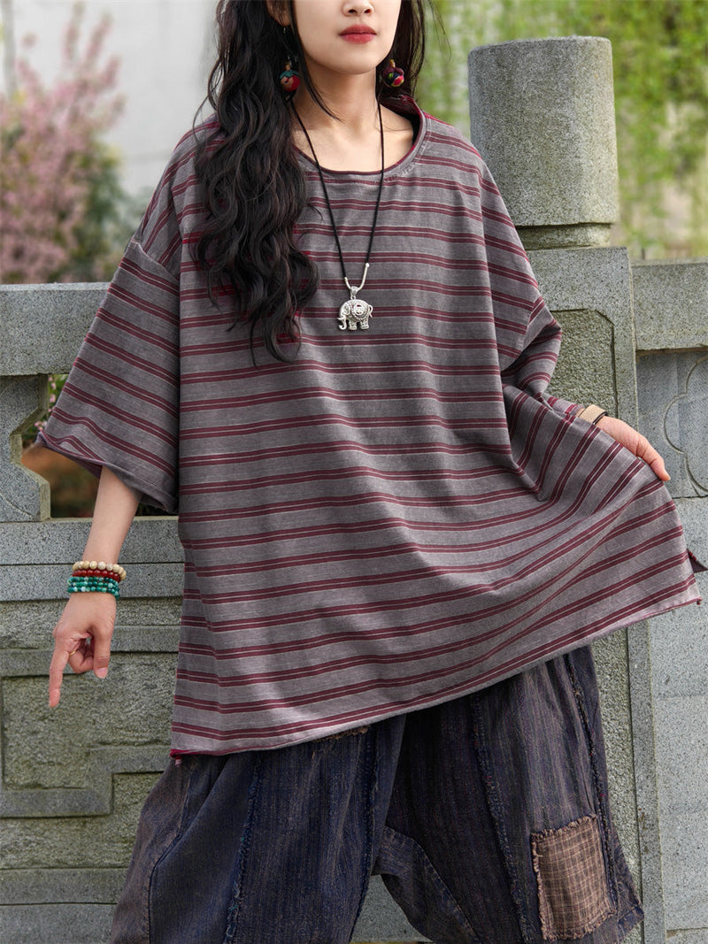The Plus Size Women Casual Summer Stripe Cotton Shirt is made of 95%Cotton 5%Spandex and features a classic stripe pattern. The collar is designed with an O-neck style. while the three quarter sleeves are raglan in design. This shirt is perfect for a casual look during the spring and summer seasons. making it a versatile addition to any wardrobe.