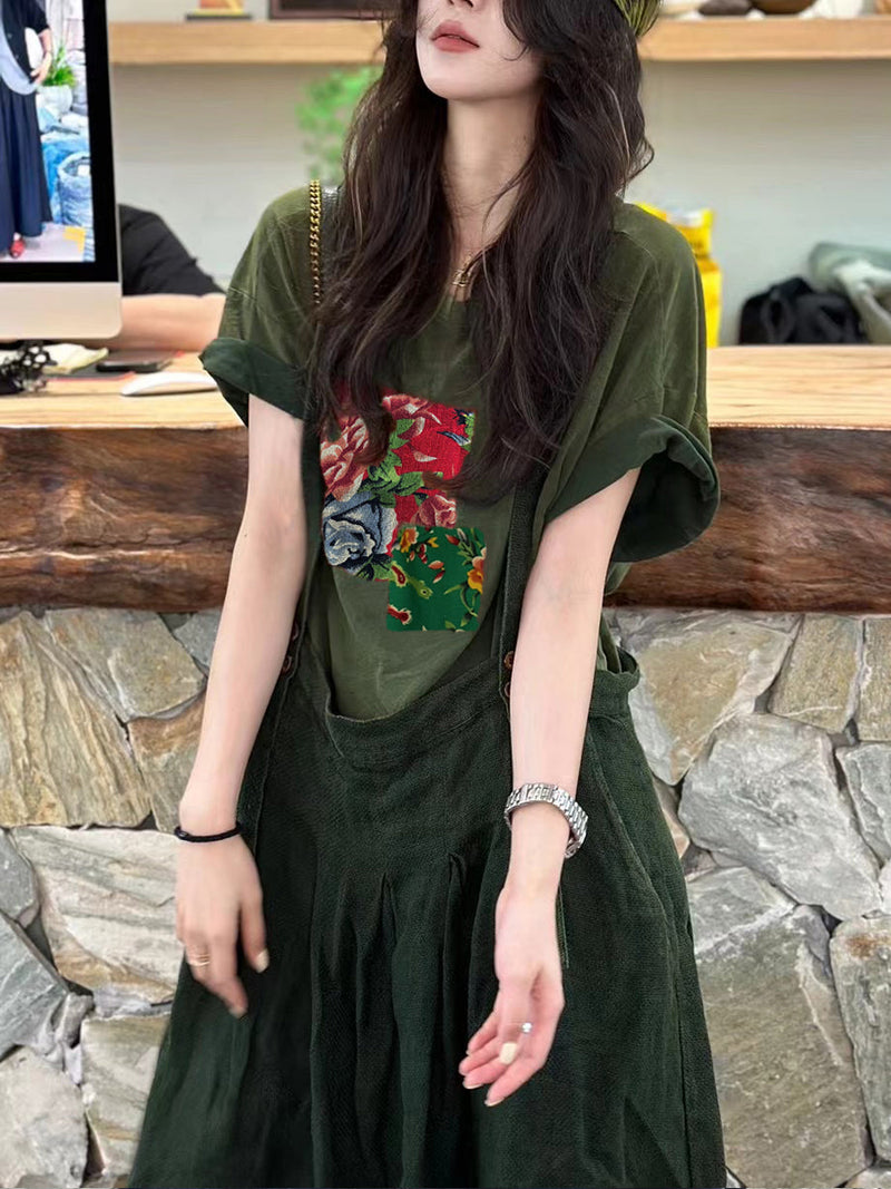 This shirt is made of 100% cotton and features a patch pattern. o-neck collar. raglan sleeves. and a vintage style. It is perfect for the summer season.