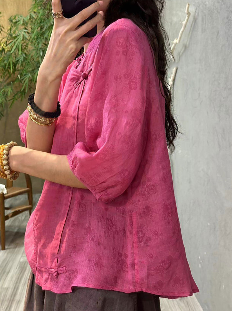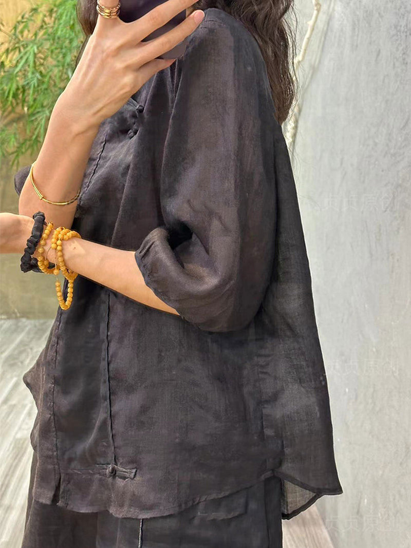 Crafted from 100% ramie. this plus size women's summer shirt features a solid color and a stand collar. With half sleeves and raglan style. it exudes an ethnic charm that is perfect for the spring and summer seasons.
