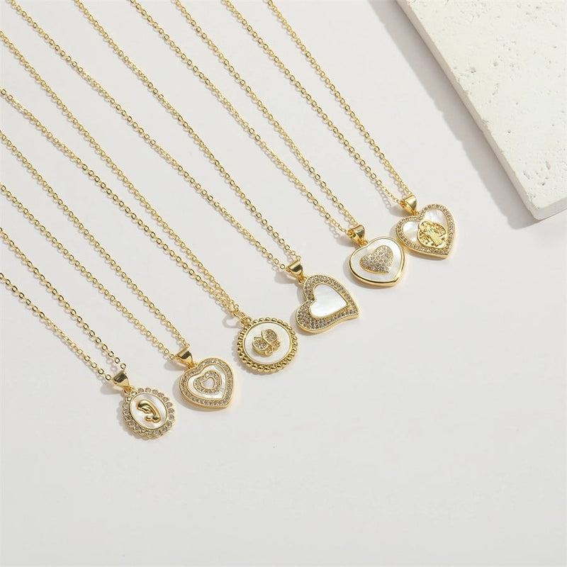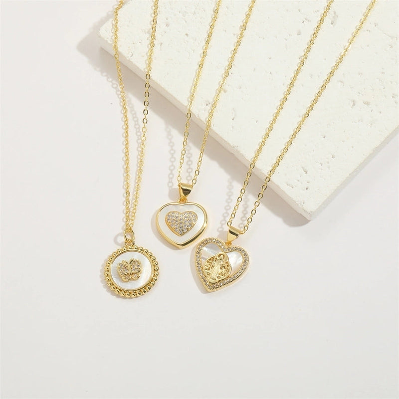 Shell Copper 14K Gold Plated Inlay Heart Shape Butterfly Zircon Pendant Necklace