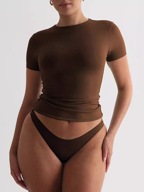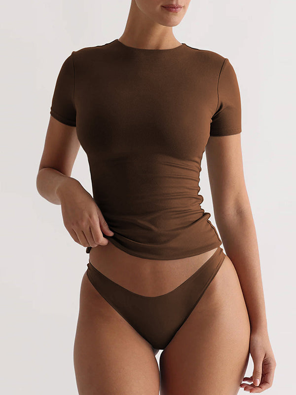 Short Sleeves Skinny Solid Color Split-Joint Round-Neck T-Shirts Tops