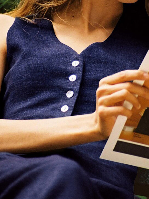 Solid Color Sleeveless Buttoned Deep V-Neck Vest Top + Pleated Straight Leg Pants Bottom Two Pieces Set