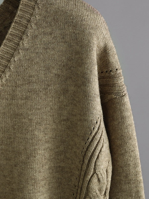 Stylish Loose Long Sleeves Solid Color V-Neck Sweater Tops& Wide Leg Pants Two Pieces Set