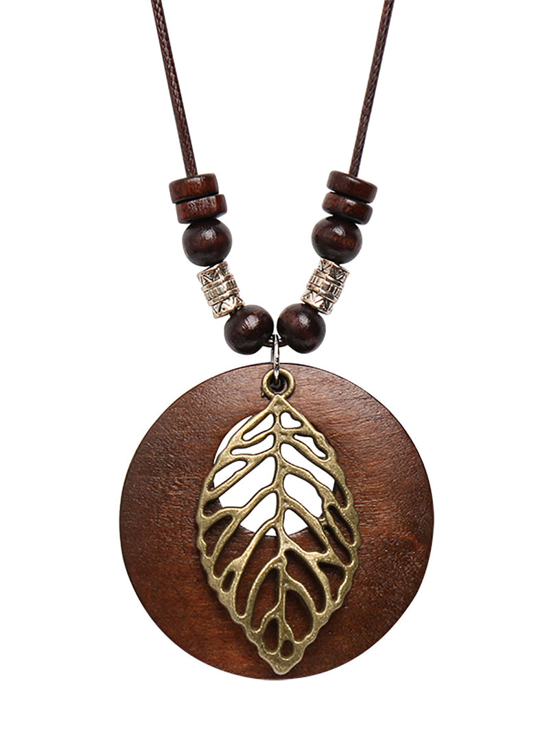 Vintage Alloy Leaf Wooden Pandent Necklace