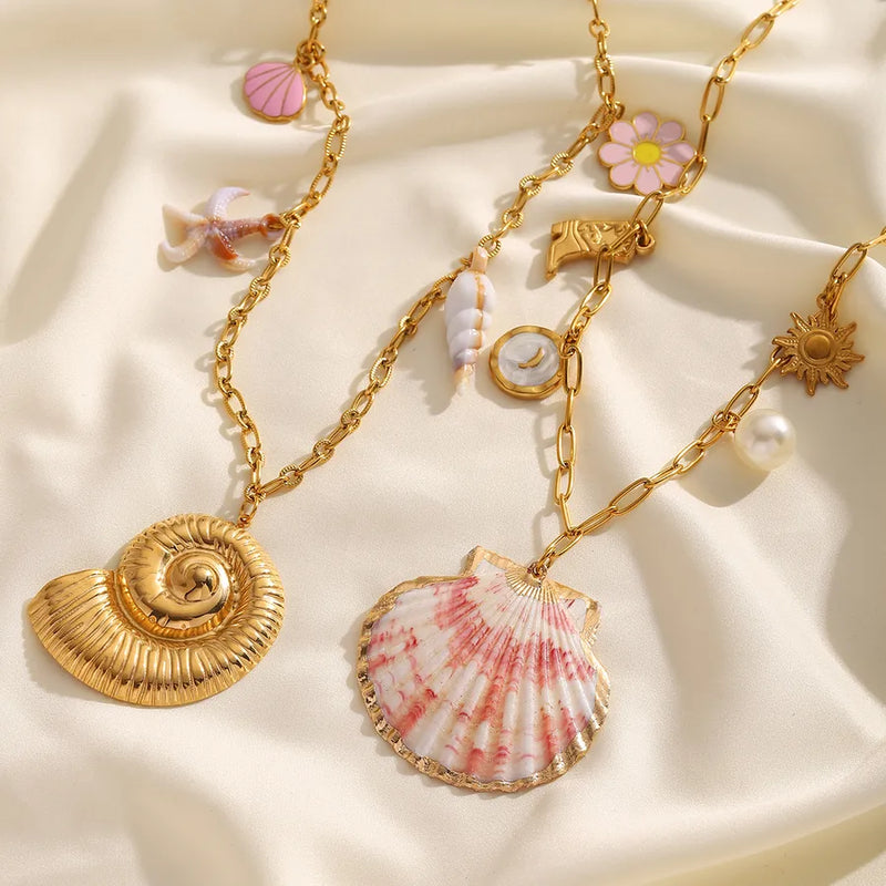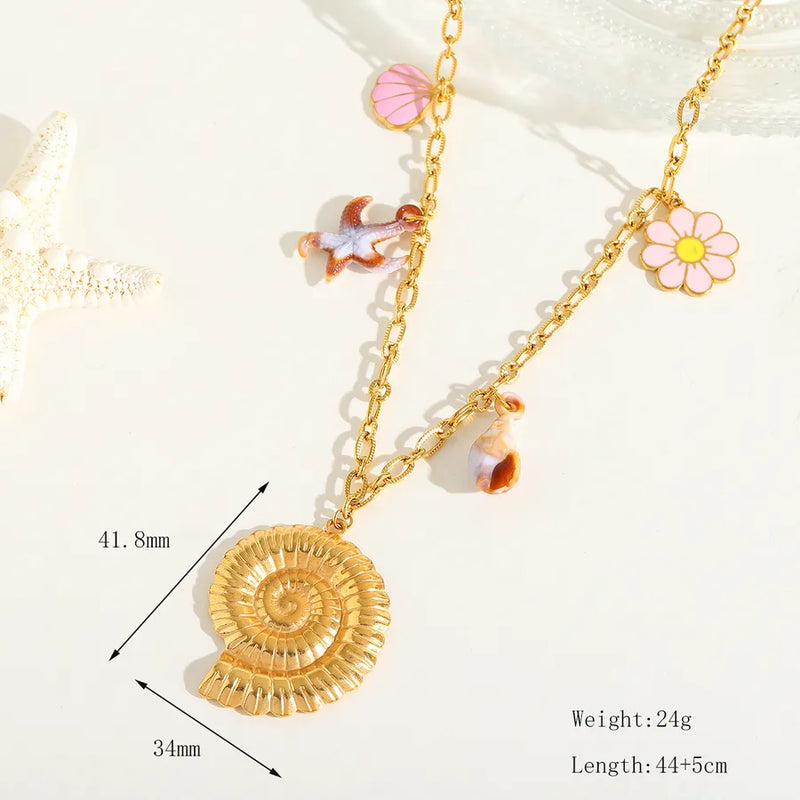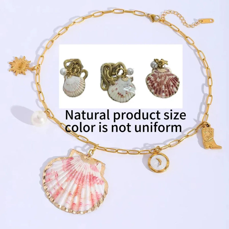 Wholesale Jewelry Casual Beach Scallop Conch 304 Stainless Steel Acrylic Imitation Pearl Natural Shell 18K Gold Plated Plating Inlay Paperclip Chain Multi Charms Necklace