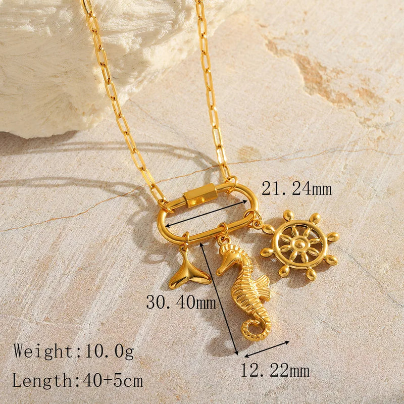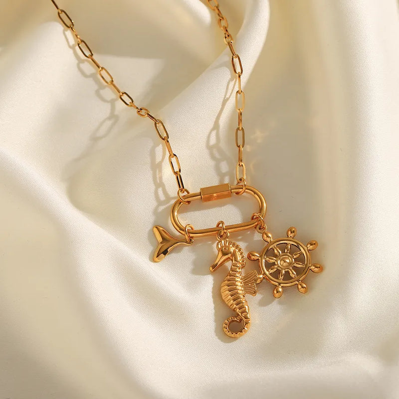 Wholesale Jewelry Casual Elegant Commute Hippocampus Fish Tail 304 Stainless Steel 18K Gold Plated Plating Paperclip Chain Multi Charms Necklace