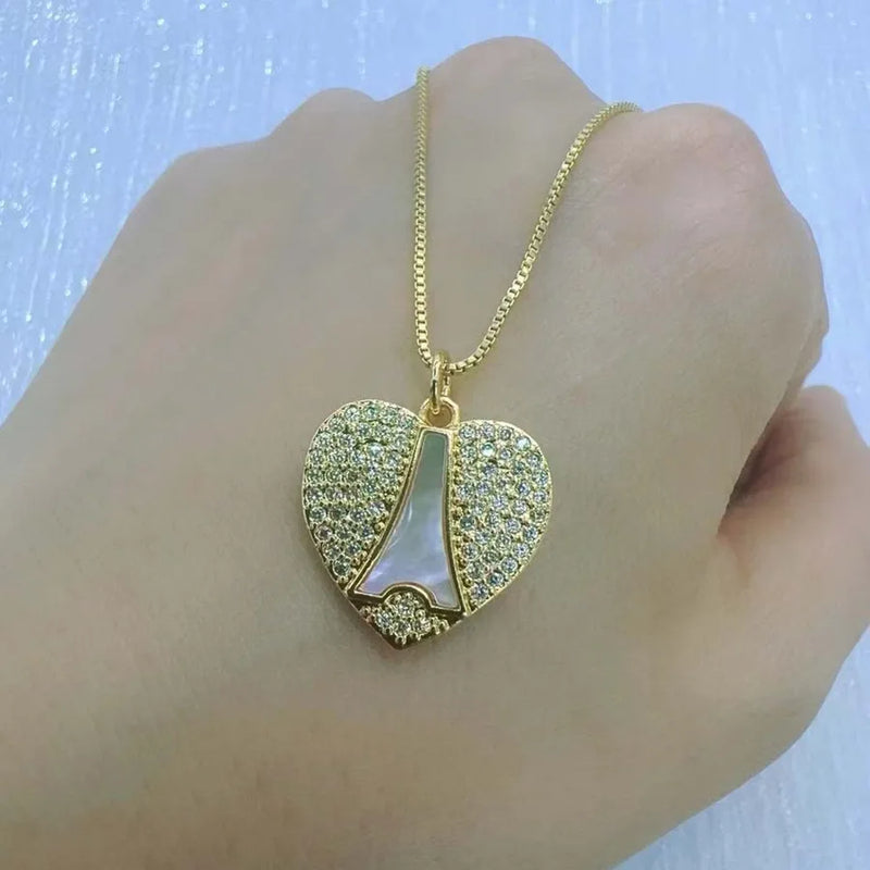 Wholesale Jewelry Casual Elegant Luxurious Eiffel Tower Heart Shape Copper Acrylic Zircon 18K Gold Plated Inlay box chain Pendant Necklace