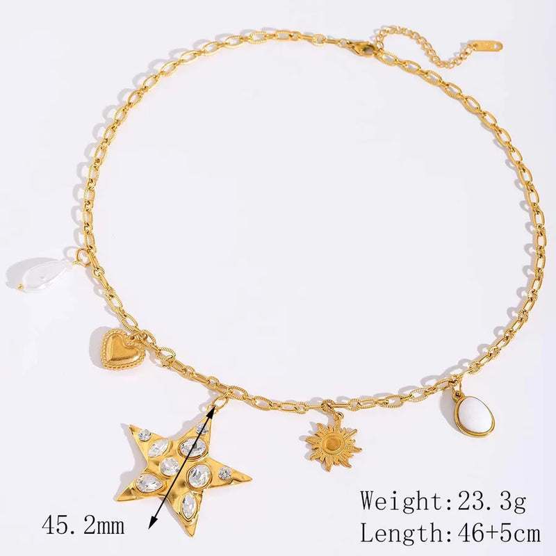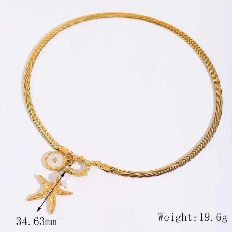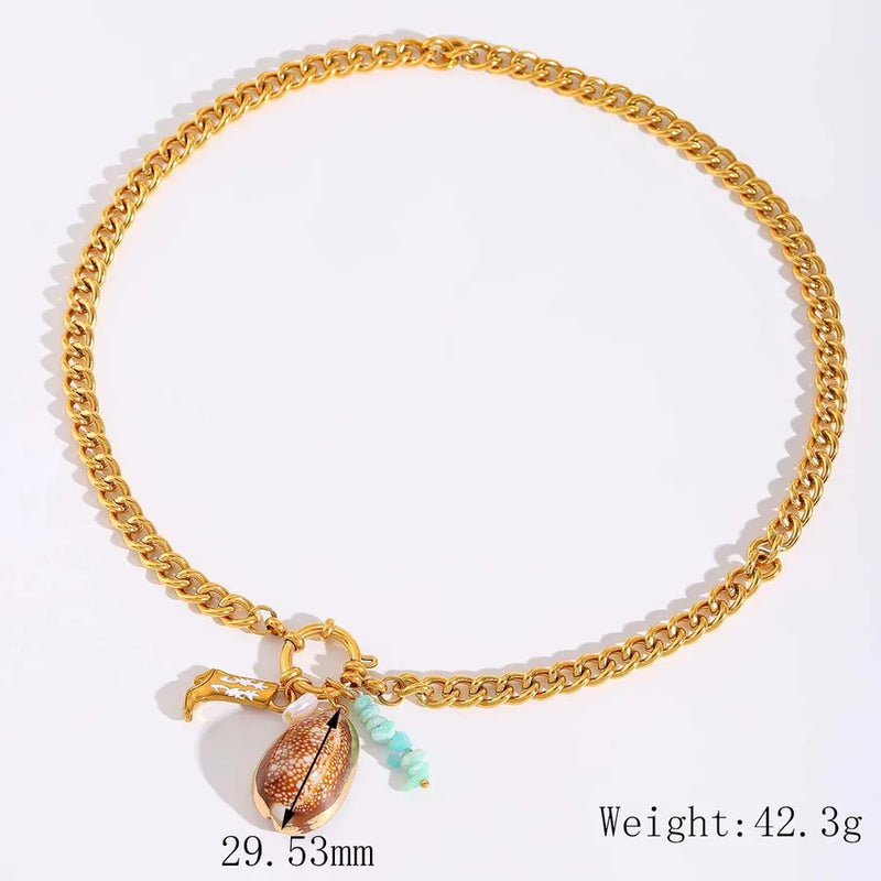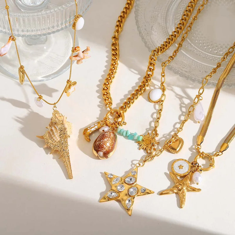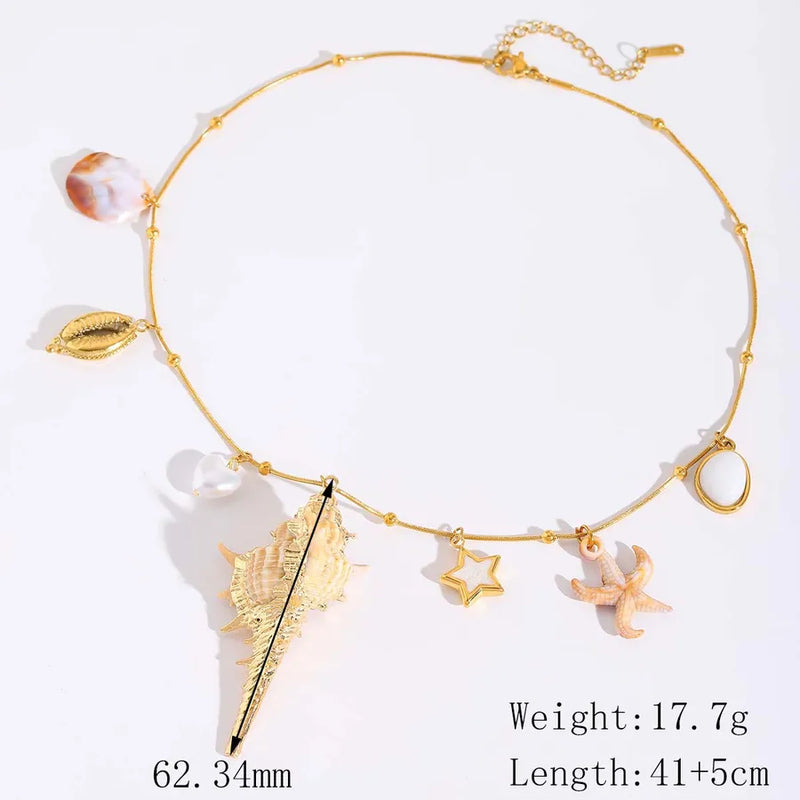 Wholesale Jewelry Casual Vacation Beach Starfish Conch 304 Stainless Steel Natural Shell Zircon 18K Gold Plated Plating Inlay cable chain snake chain Multi Charms Necklace