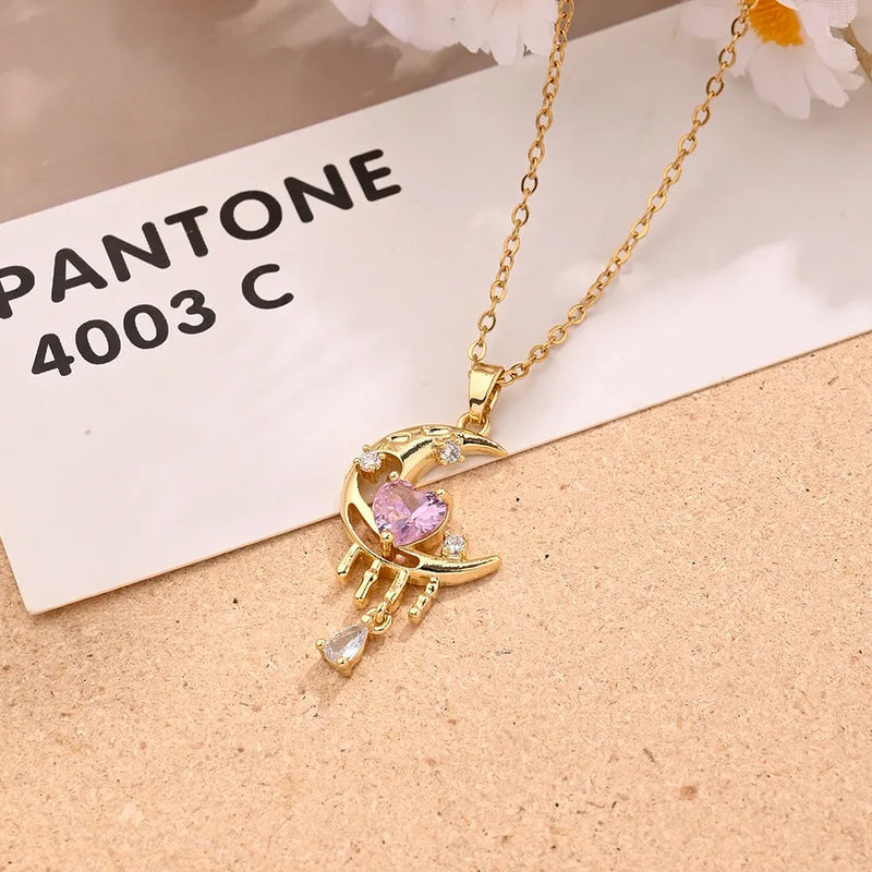 Heart-Shaped Zircon Moon Necklace (Gold)【String Length: 400+45mm】