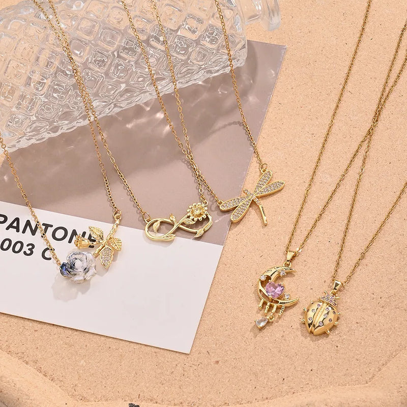 Wholesale Jewelry Casual Vacation Simple Style Moon Beetles Dragonfly Copper Resin Zircon 18K Gold Plated Polishing Inlay cable chain Pendant Necklace