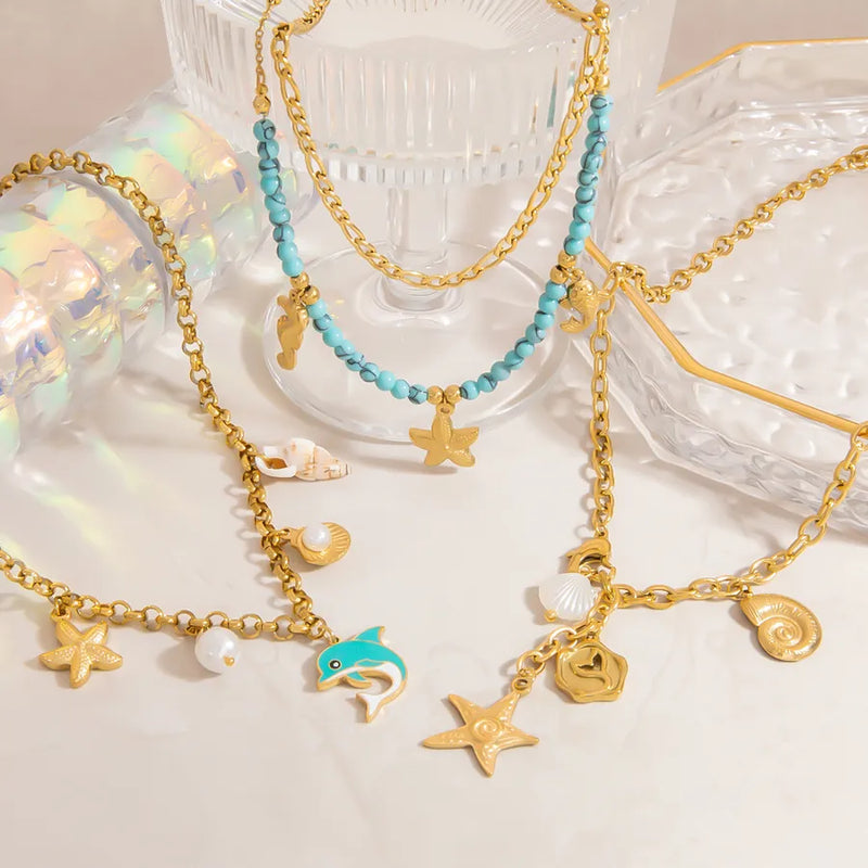 Wholesale Jewelry Casual Vacation Simple Style Starfish 304 Stainless Steel 18K Gold Plated cable chain Multi Charms Necklace