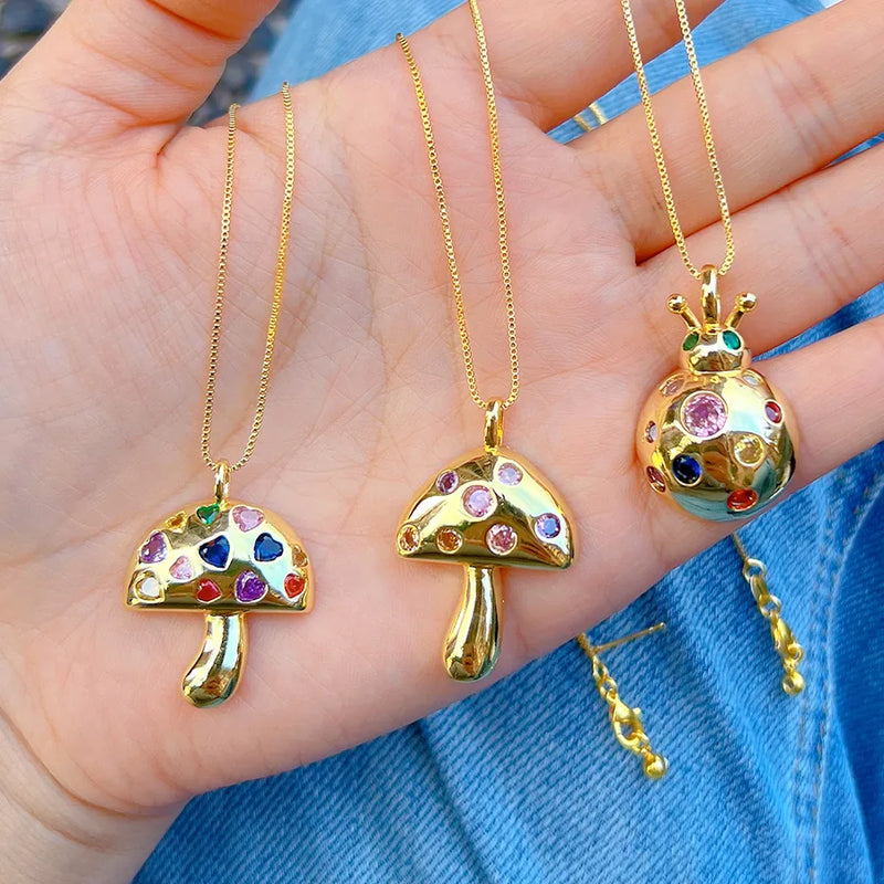 Wholesale Jewelry Casual Vacation Sweet Beetles Mushroom Copper Zircon 18K Gold Plated Polishing Inlay box chain Pendant Necklace