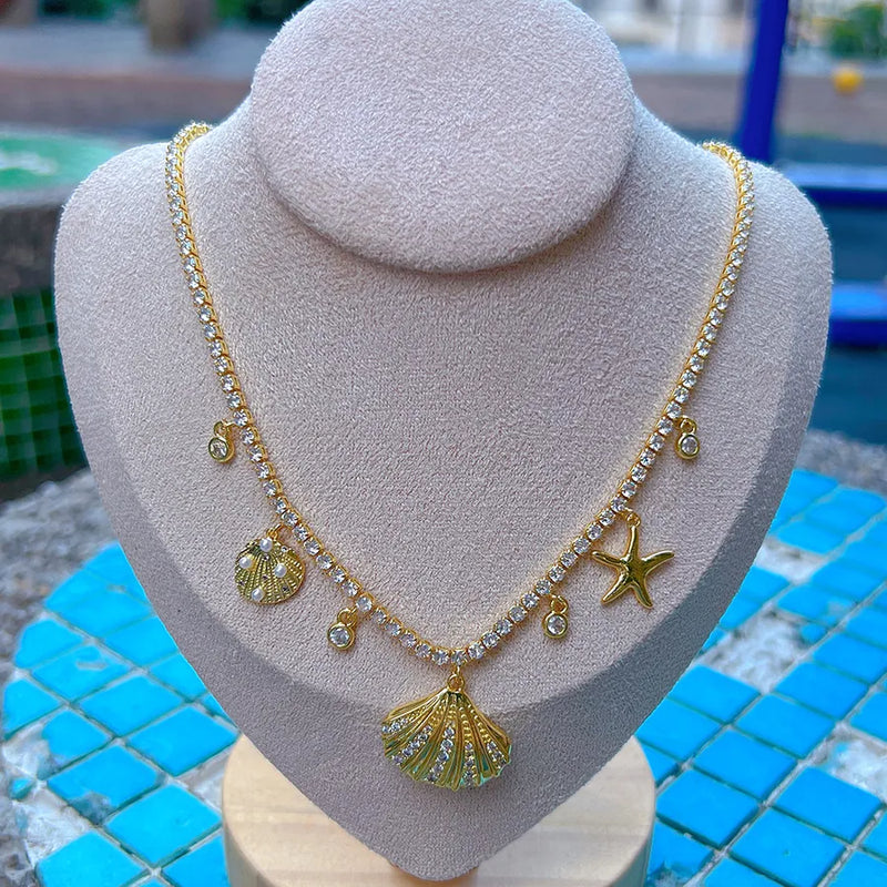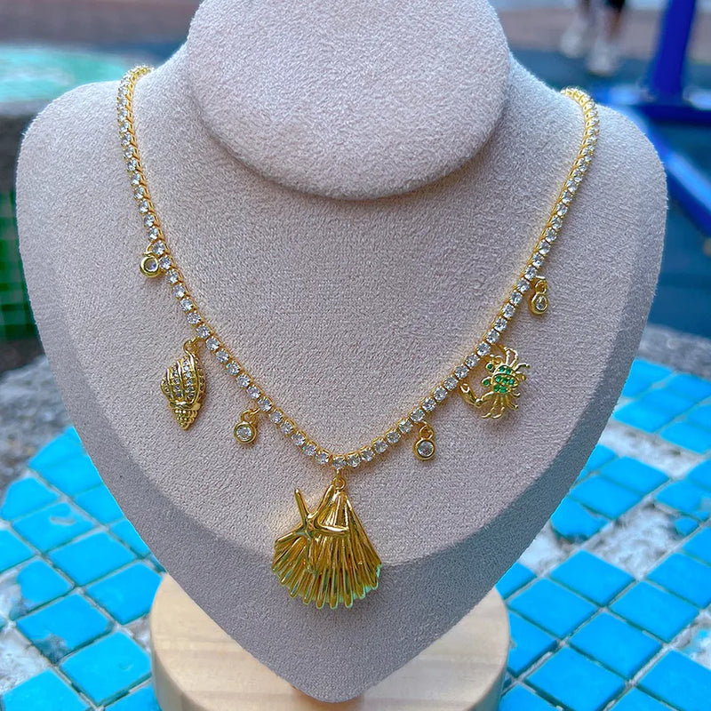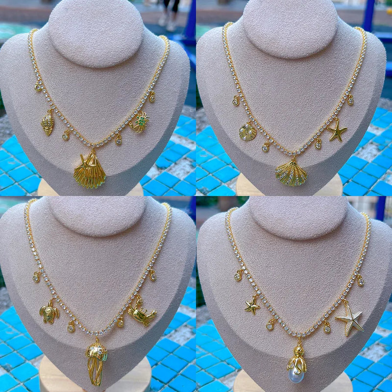 Shell & Starfish & Conch & Crab Full Diamond Necklace (Gold)
