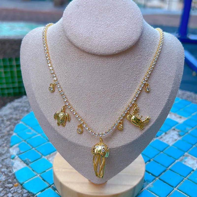 Jellyfish & Crab & Turtle Full Diamond Necklace (Gold)