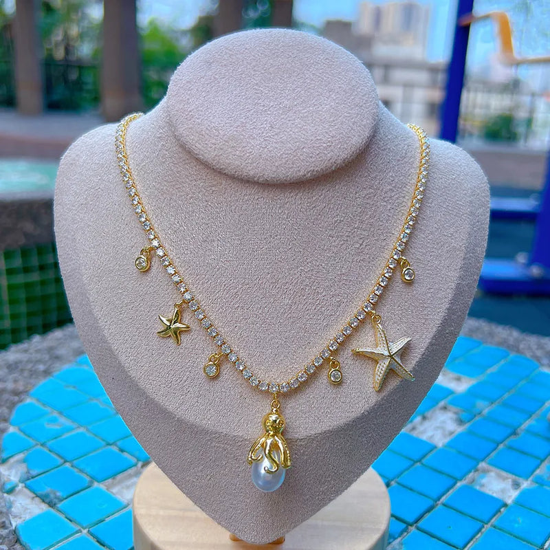 Octopus & Starfish Full Diamond Necklace (Gold)