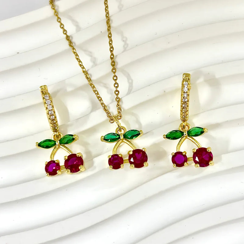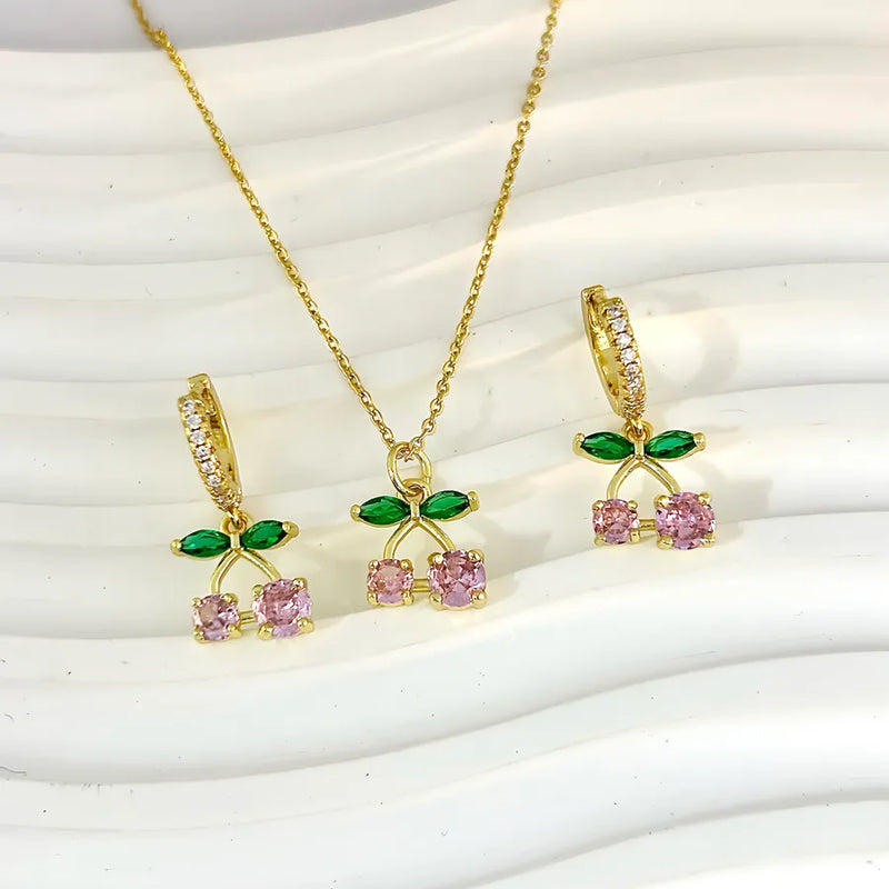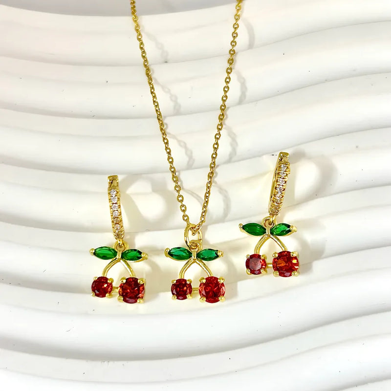 Wholesale Jewelry Elegant Cute Cherry Copper Zircon 18K Gold Plated Earrings Necklace Jewelry Set