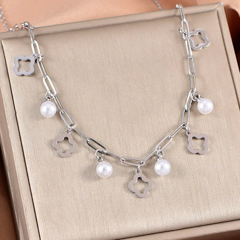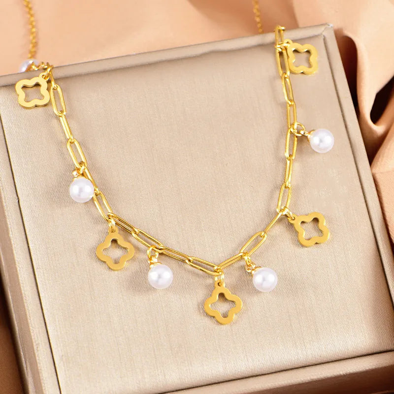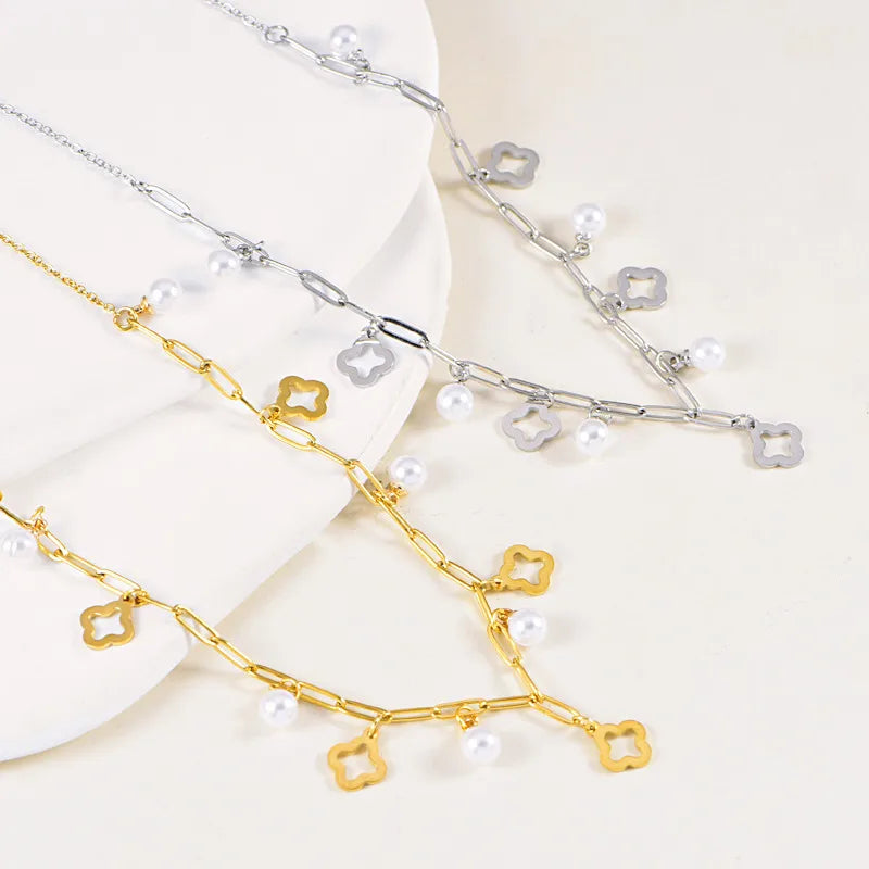 Wholesale Jewelry Elegant Four Leaf Clover 304 Stainless Steel Plating Paperclip Chain Multi Charms Necklace