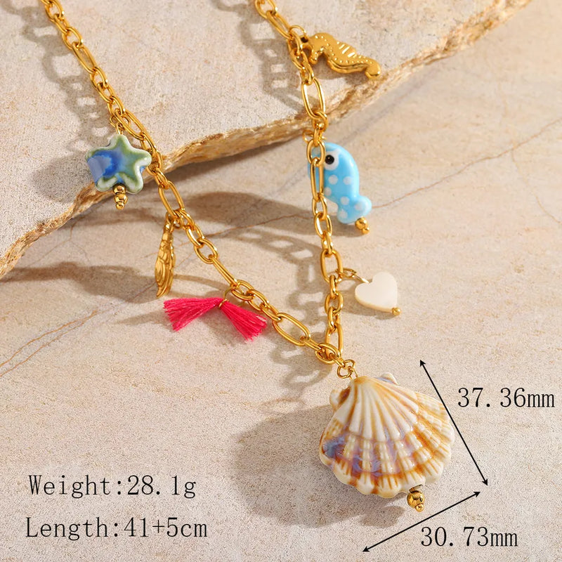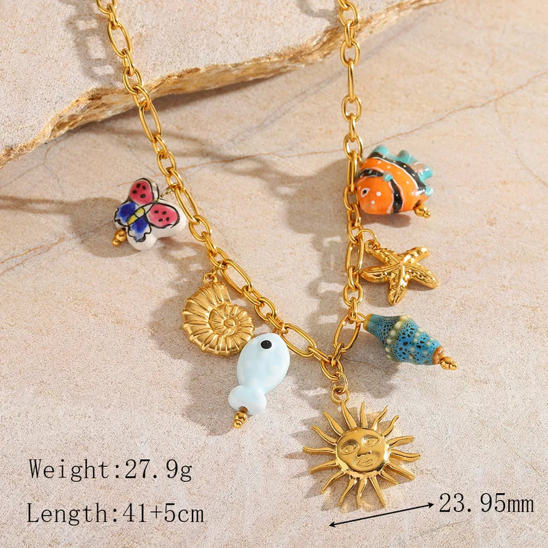 Wholesale Jewelry IG Style Cute Commute Sun Starfish Conch 304 Stainless Steel Acrylic 18K Gold Plated Plating Inlay cable chain Multi Charms Necklace