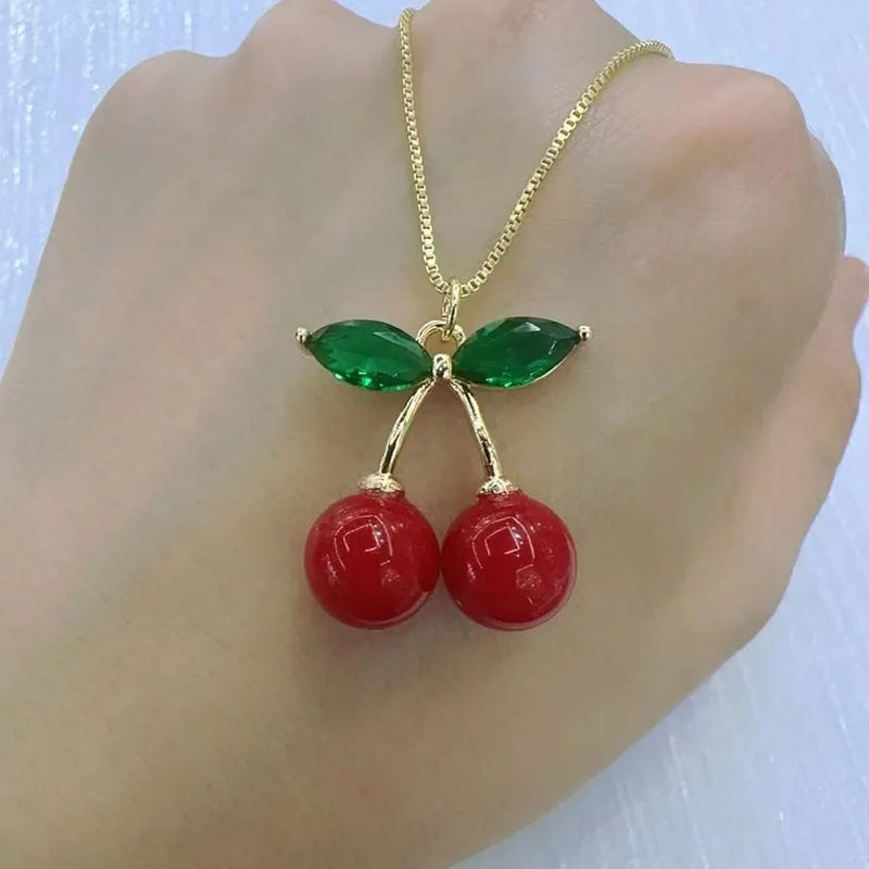 Wholesale Jewelry Sweet Pastoral Artistic Cherry Copper Zircon 18K Gold Plated Epoxy Inlay box chain Pendant Necklace