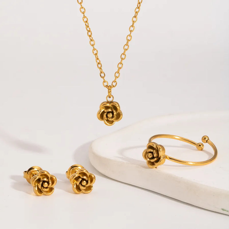 Wholesale Jewelry Vacation Classic Style Rose 304 Stainless Steel 18K Gold Plated cable chain Rings Earrings Necklace