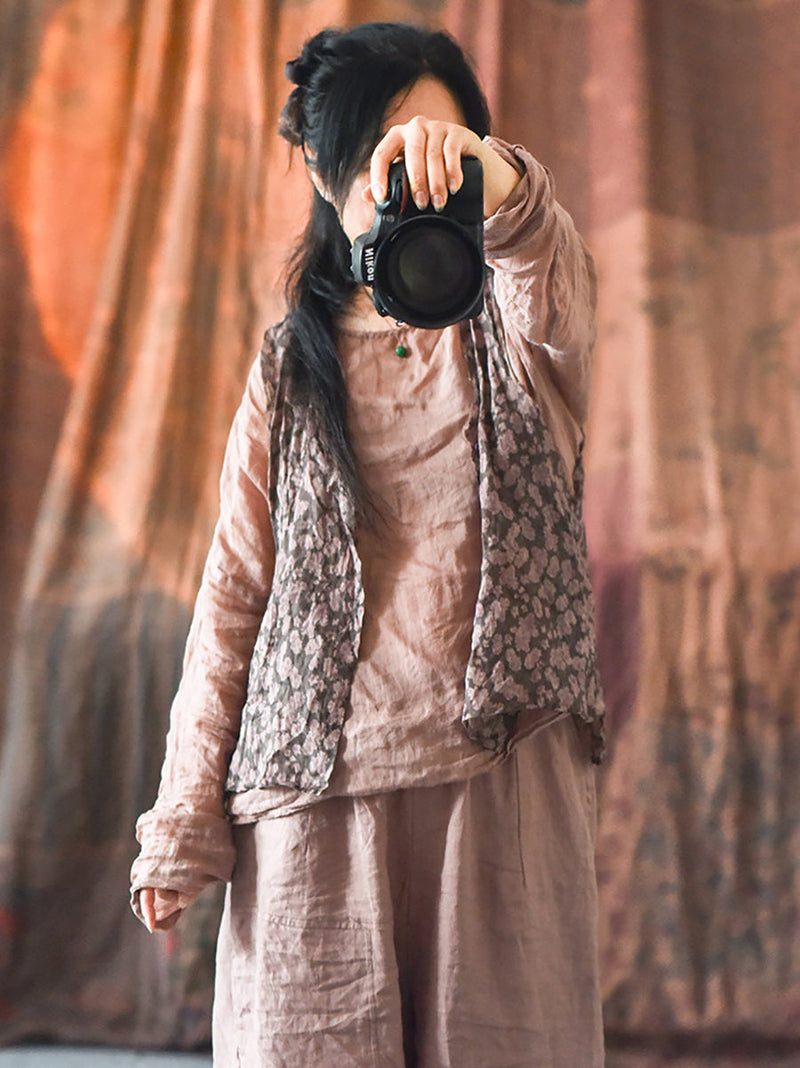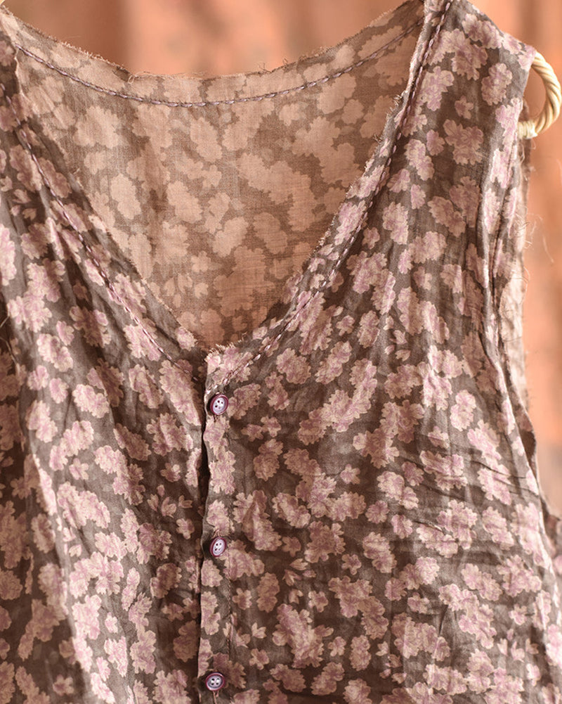 Women Artsy Floral Summer Ramie V-Neck Vest