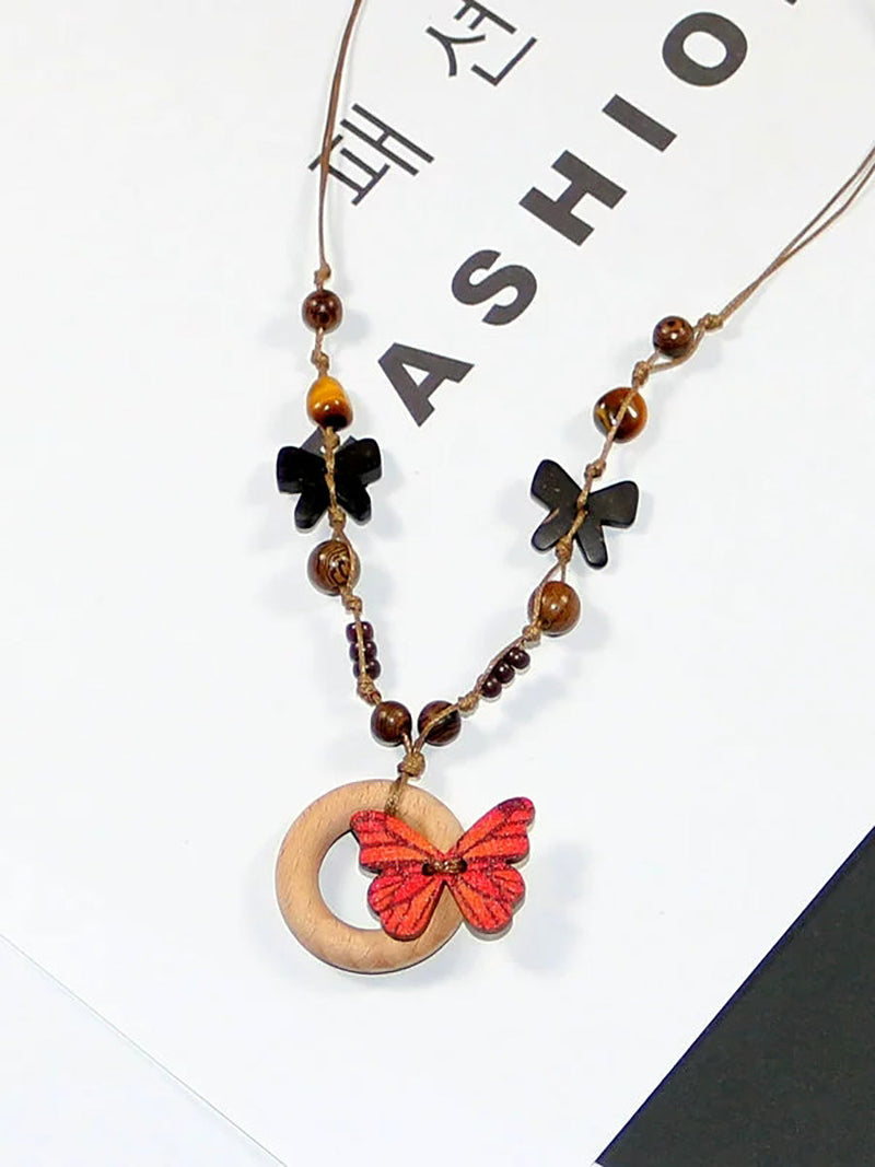 Women Artsy Wooden Butterfly Bead Necklace