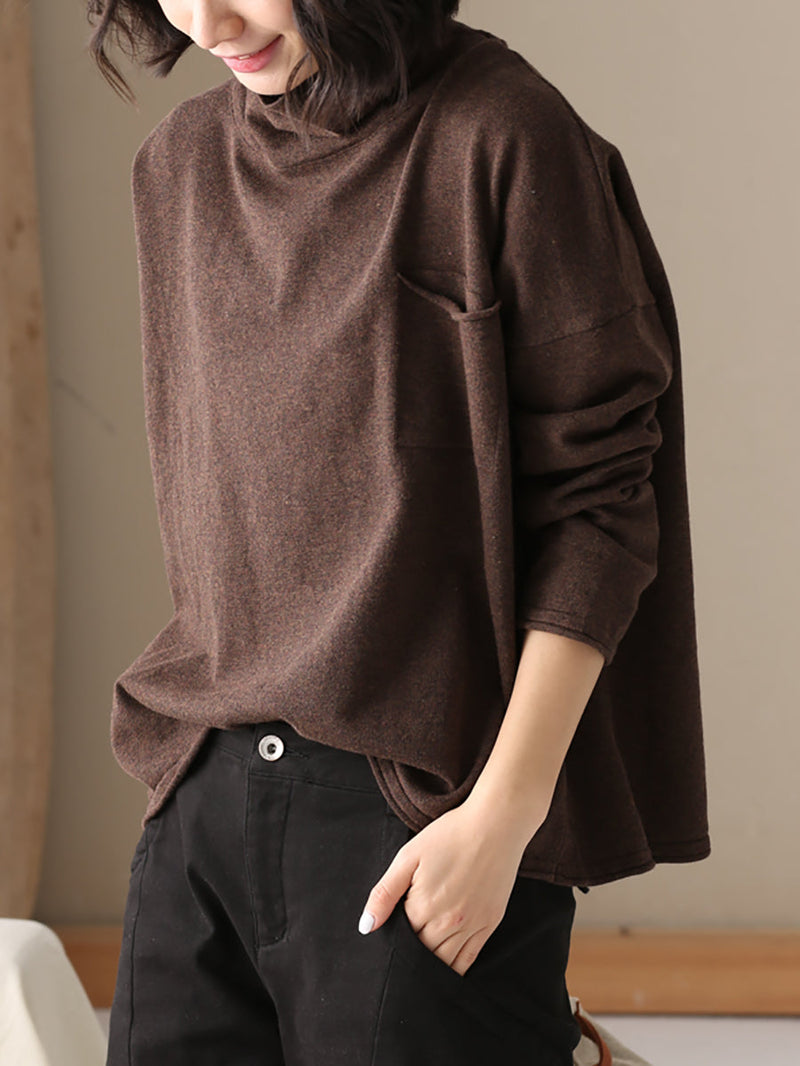 Women Autumn Casual Pure Color 100%Cotton Turtleneck Shirt