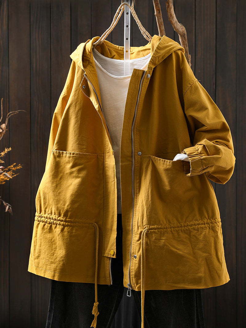 Women Autumn Casual Pure Color Hooded Cotton Jacket
