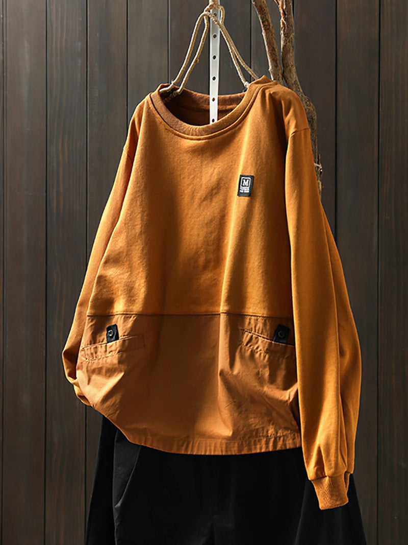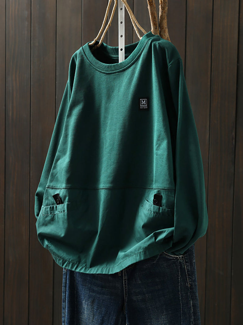 Women Autumn Casual Pure Color Spliced 100%Cotton Sweatshirt