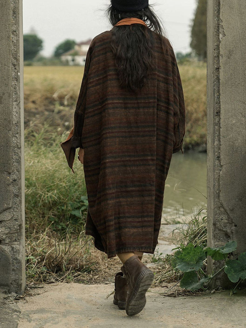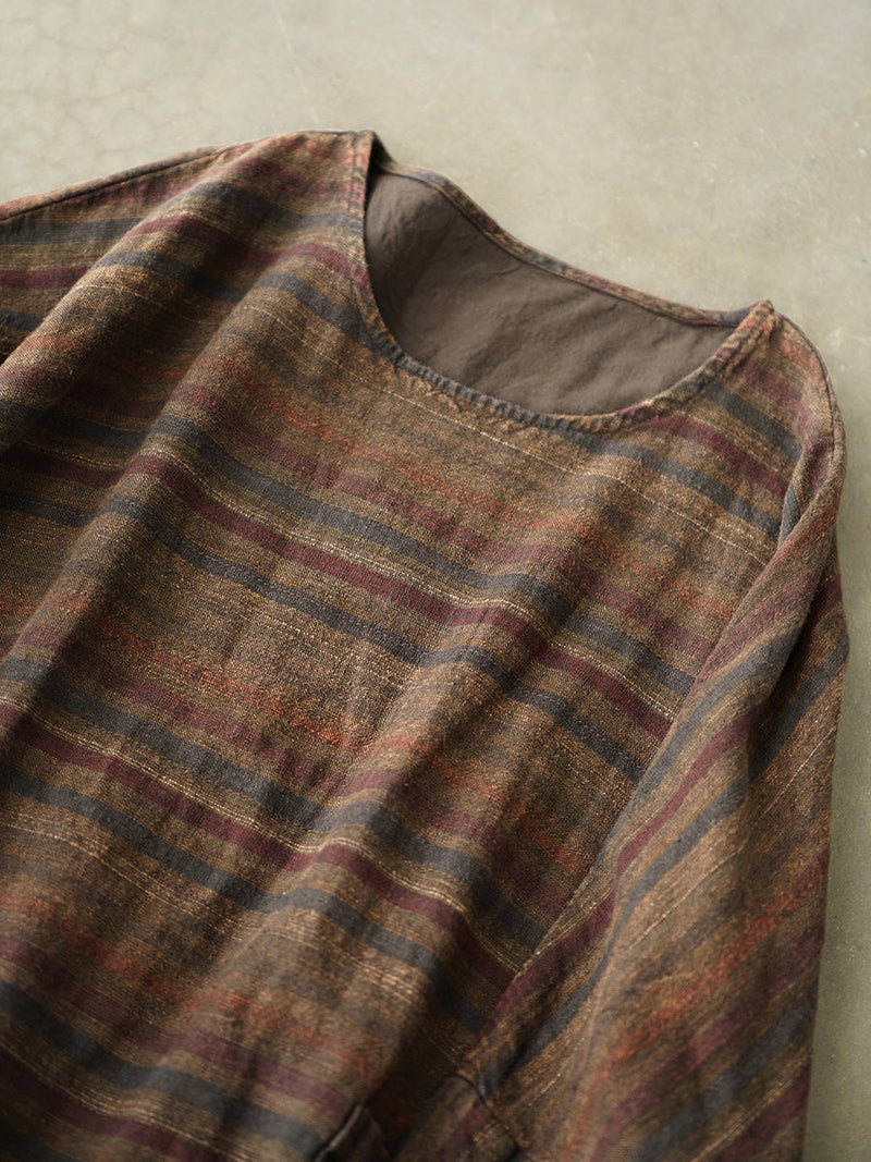 This dress is made of linen fabric with a classic stripe pattern. It features an O-neck collar and raglan sleeves with a retro style that is perfect for the autumn and winter season. The full-length. long sleeves add a touch of warmth and elegance to this stylish dress.