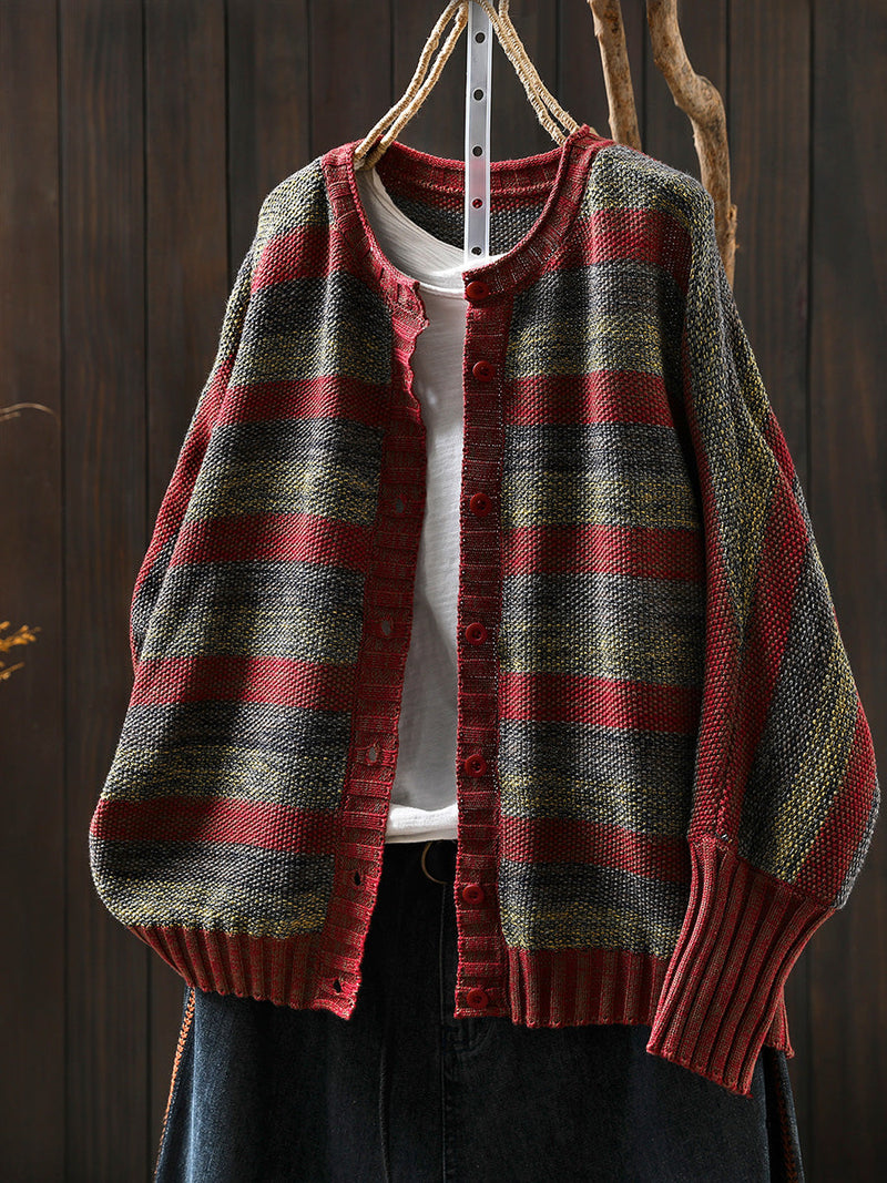 Crafted from a blend of 45% cotton and 55% acrylic. this sweater coat features a stylish stripe pattern. It includes an O-neck collar and vintage-inspired raglan full sleeves. designed for comfort and elegance during spring and autumn seasons.