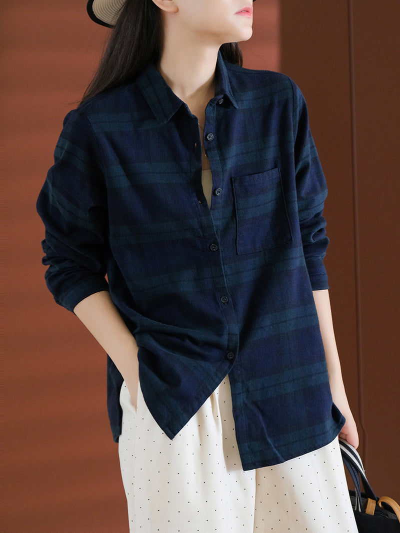 Women Autumn Plaid Turn-down Collar 100%Cotton Shirt