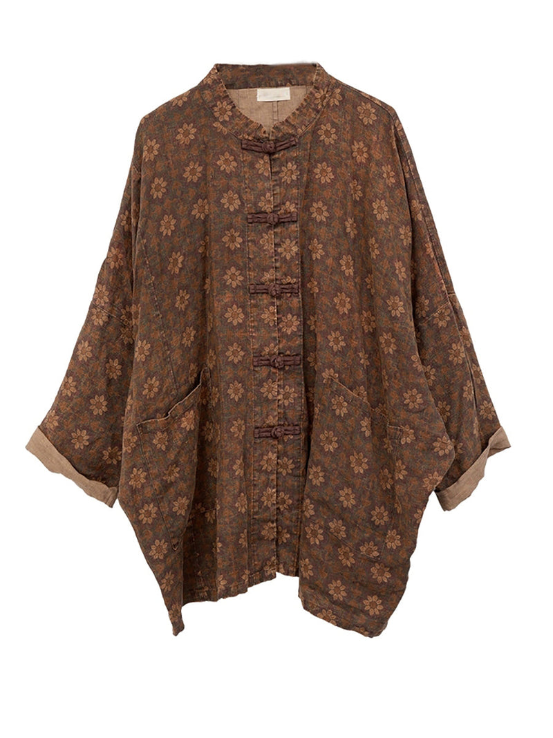 Women Autumn Retro Flower Linen Stand Collar Coat