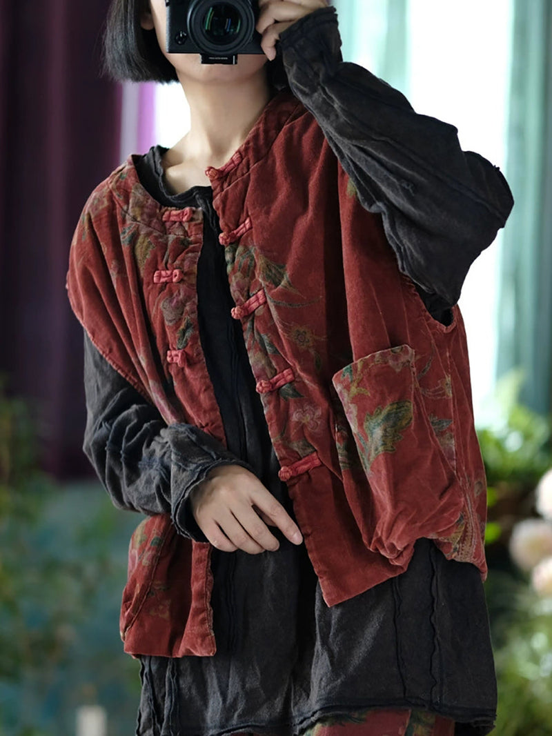 Women Autumn Retro Flower O-Neck Cotton Padded Vest